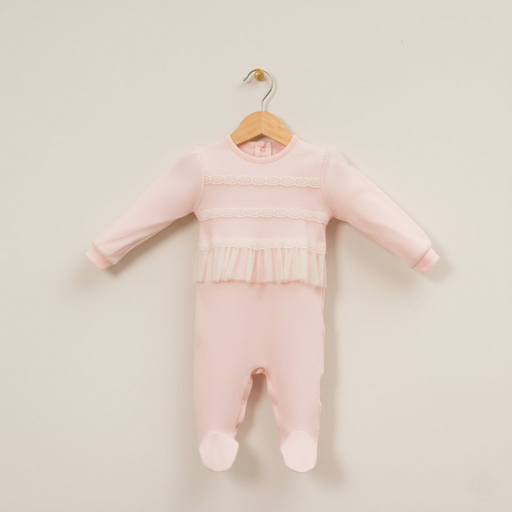 This adorable and comfortable romper is perfect for your little one. Made from soft, breathable fabric, it features delicate lace and tulle ruffles across the chest. The long sleeves and covered feet ensure your baby stays cozy, while the convenient snap closures make for easy diaper changes. Ideal for special occasions, photoshoots, or everyday cuteness, this charming pink romper combines style and comfort effortlessly.