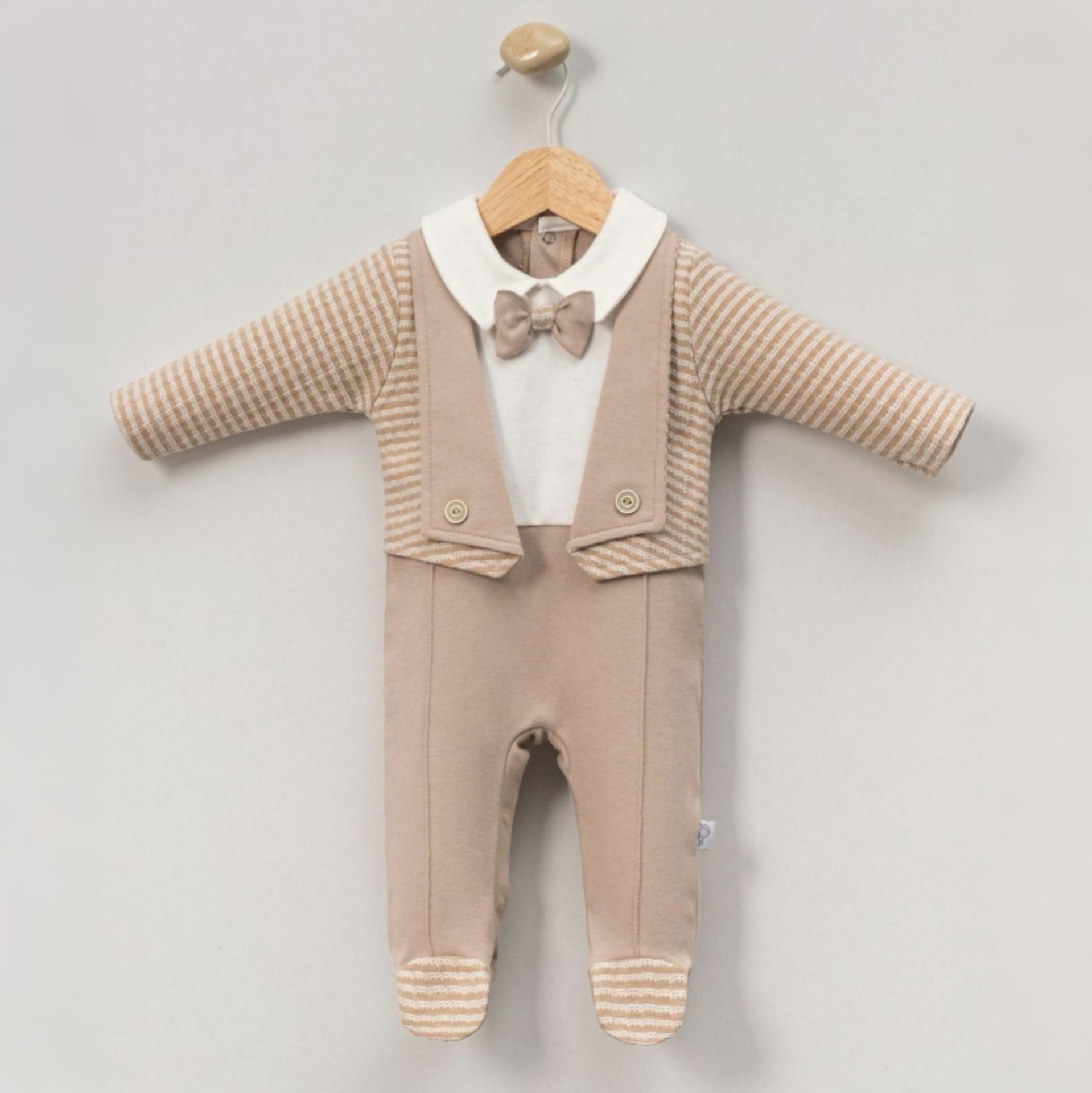 Dress your little one in refined comfort with our beige and white formal baby romper. This one-piece outfit features a white shirt with a rounded collar, an attached beige vest with striped lapels and sleeves, and a coordinating bow tie. The footed bottom and soft knit fabric ensure warmth and ease, while decorative buttons add a tailored touch.