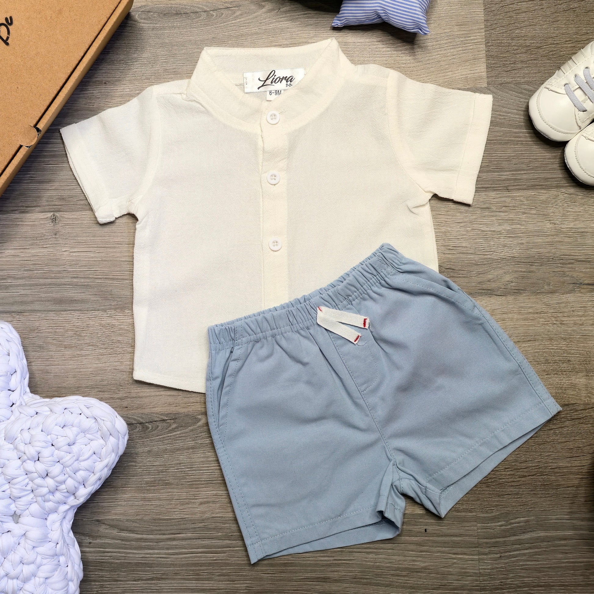 This Casual Set in blue and white features blue fabric shorts paired with a white linen Chinese-style shirt. Designed for comfort and elegance, the breathable linen shirt complements the soft, durable shorts, creating a balanced outfit ideal for warm weather. Perfect for casual or semi-formal occasions, this set combines traditional design with modern comfort.