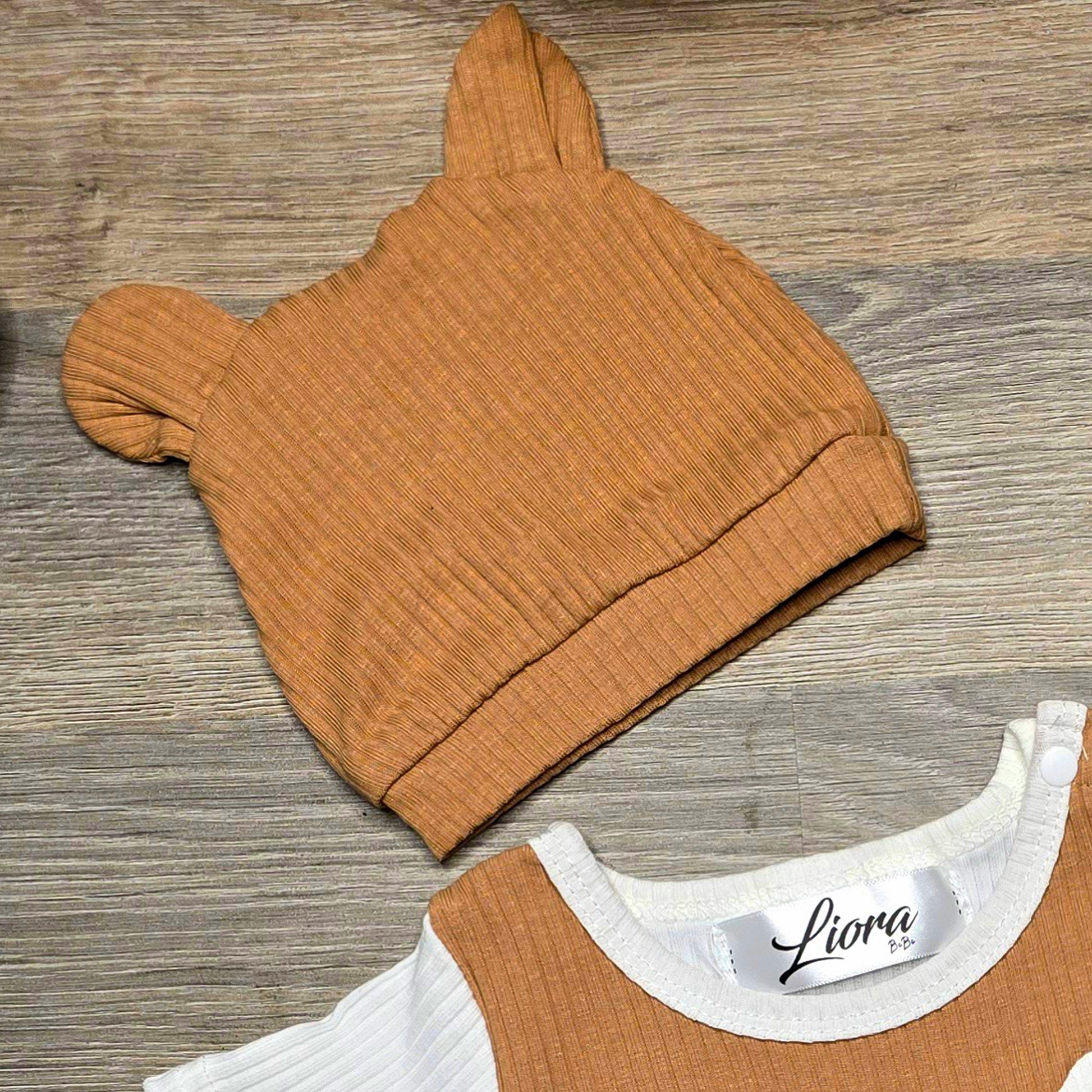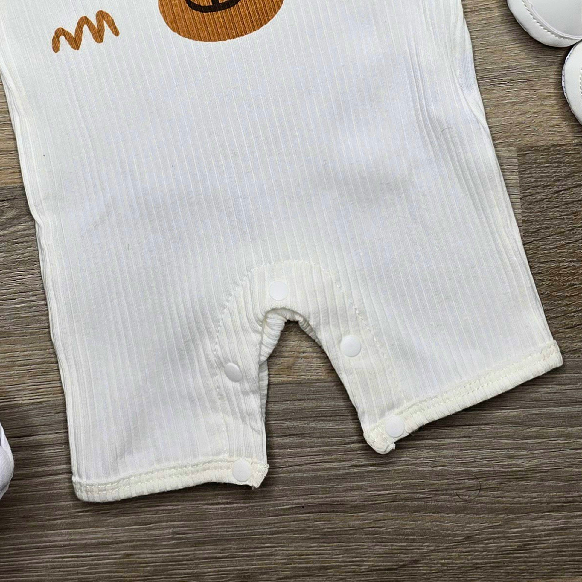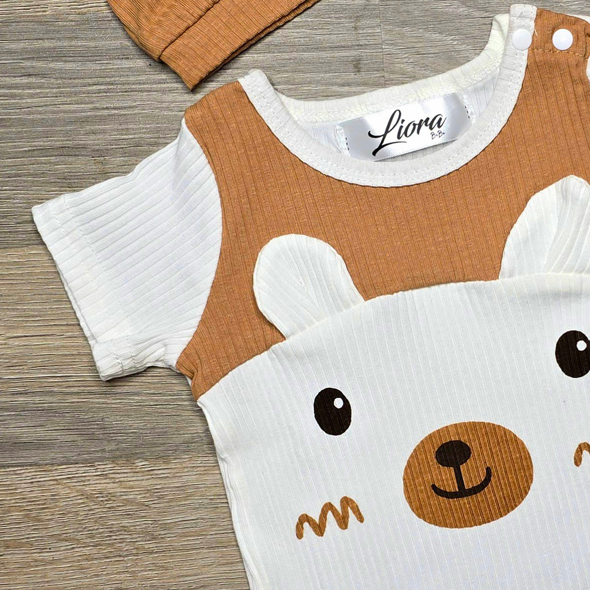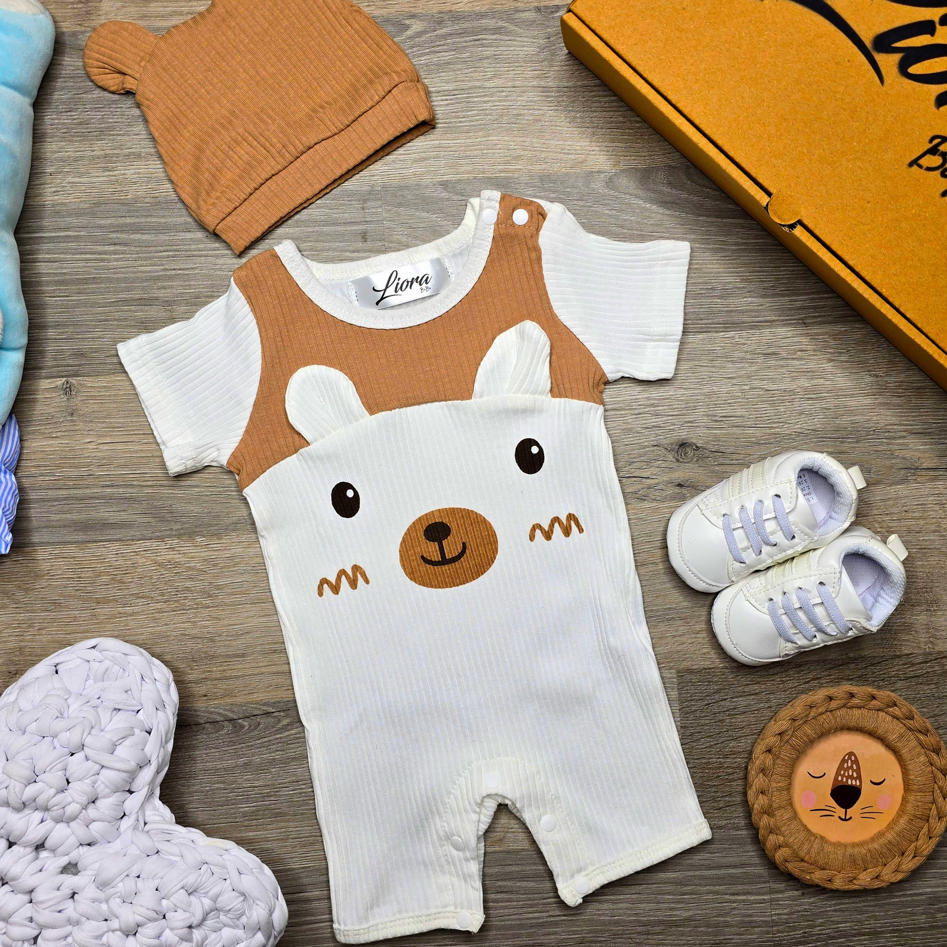 This baby boy summer overall combines comfort and style with its breathable brown and white fabric, perfect for warm weather. Designed for ease of movement and quick dressing, it includes a matching hat to provide gentle sun protection. Ideal for keeping your little one cool and adorable during summer outings.
