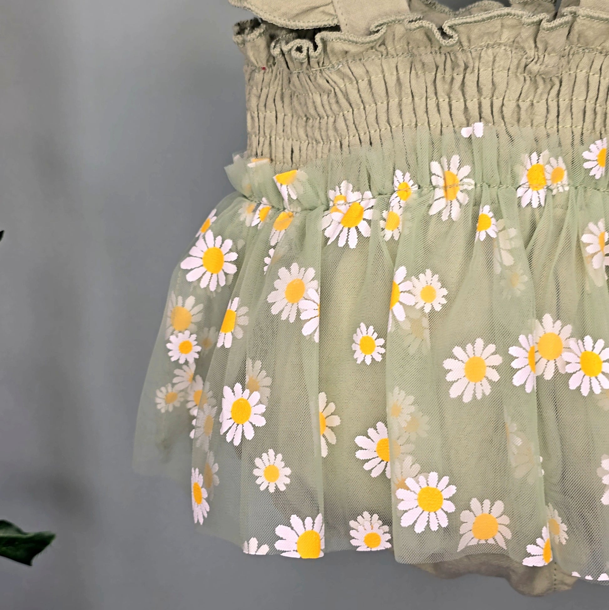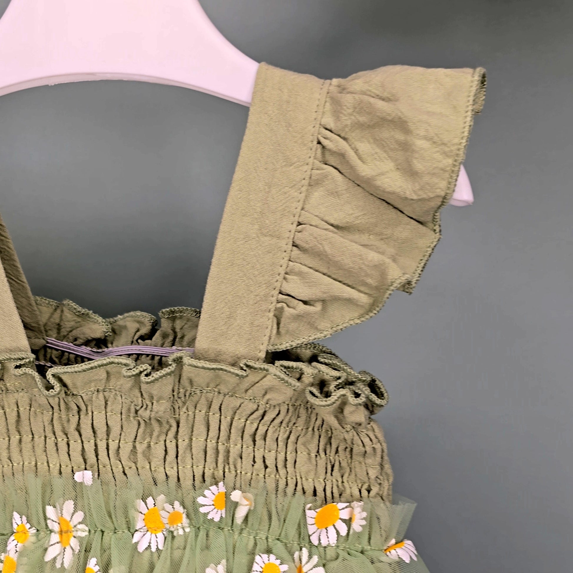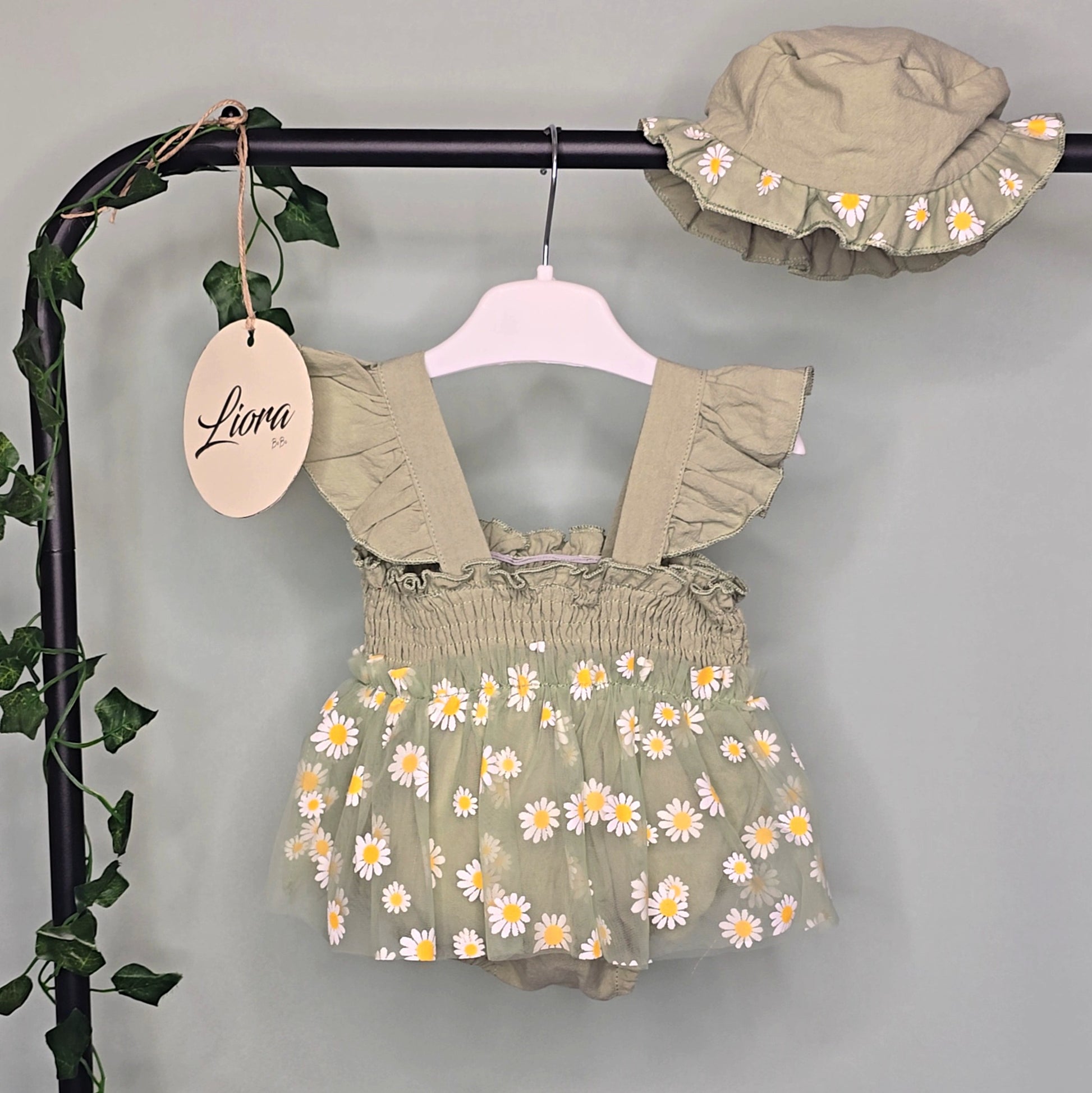"Adorn yourself in this floral casual dress, complete with a delicate matching hat and a whimsical tulle touch. Perfect for any occasion, its elegant green hue and dainty flower pattern will make you the center of attention. Elevate your style with this must-have dress."