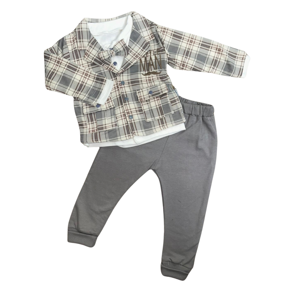 Give your little one a polished look with our gray plaid baby boy outfit. This stylish set includes a classic plaid jacket in shades of gray, beige, and white with “MAN” printed on the chest, a crisp white shirt, a coordinating bow tie, and cuffed gray pants with an elastic waistband. Designed for weddings, birthdays, or formal family gatherings, this ensemble blends timeless tailoring with playful charm.