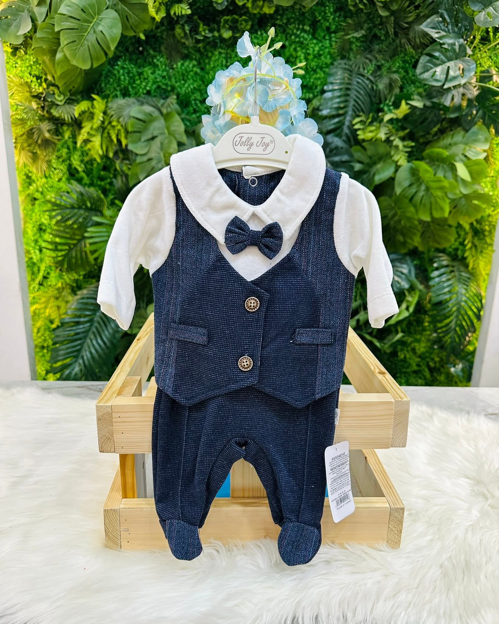 This dashing baby onesie brings formal flair to cozy wear. Styled to resemble a classic navy blue suit, it features a white shirt base with an attached vest, two decorative buttons, and faux pockets for a tailored look. A matching bow tie at the collar adds charm, while the footed design completes the ensemble with head-to-toe elegance. Perfect for weddings, holidays, or milestone photo shoots, this outfit offers the sophistication of a suit with the softness of a onesie.