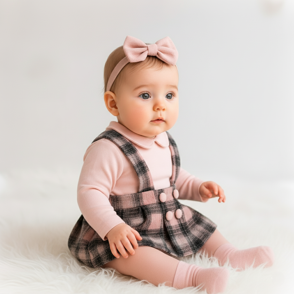 Get your camera ready! This adorable outfit is designed to make your little one shine. It includes a sweet, pink bodysuit with a delicate collar and a charming plaid overall dress with cute button accents.