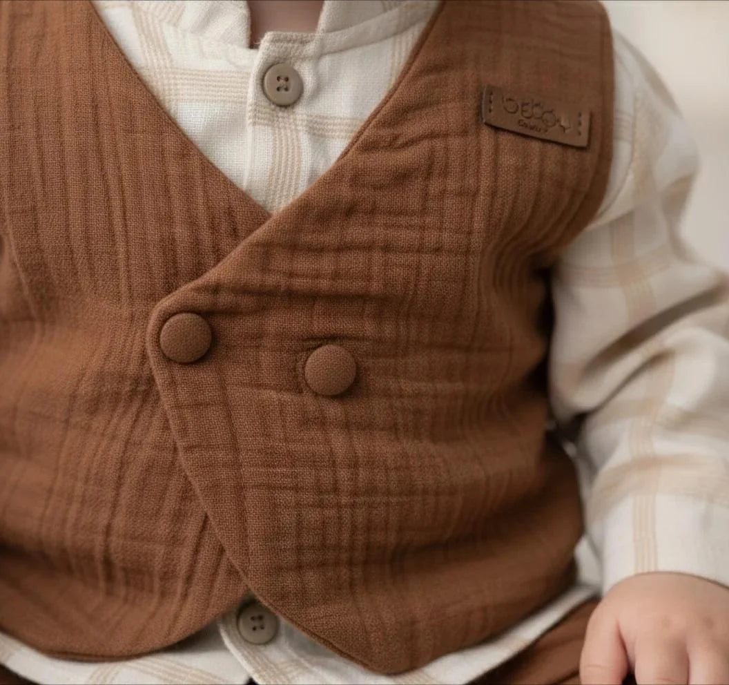 This beautifully coordinated toddler outfit blends rustic charm with refined detail. The beige plaid long-sleeve shirt features a delicate ruffled collar, layered beneath a rich brown textured vest with decorative buttons and a subtle chest label. Matching brown pants with an elastic waistband and rolled cuffs complete the look, offering both comfort and style. Crafted from soft, crinkled fabric, this ensemble is perfect for autumn outings, family photos, or semi-formal occasions where warmth and elegance meet.