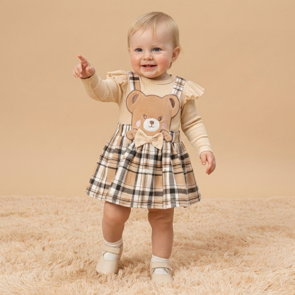 Add playful charm to your baby girl’s wardrobe with our plaid teddy suspender dress set. This two-piece ensemble includes a beige ribbed long-sleeve onesie with ruffled shoulders and snap buttons for easy changes, paired with a plaid suspender dress featuring a teddy bear face detail, a bow accent, and a flared skirt in beige, white, and black plaid. Perfect for birthdays, family photos, or boutique gifting, this outfit blends functionality with adorable style.