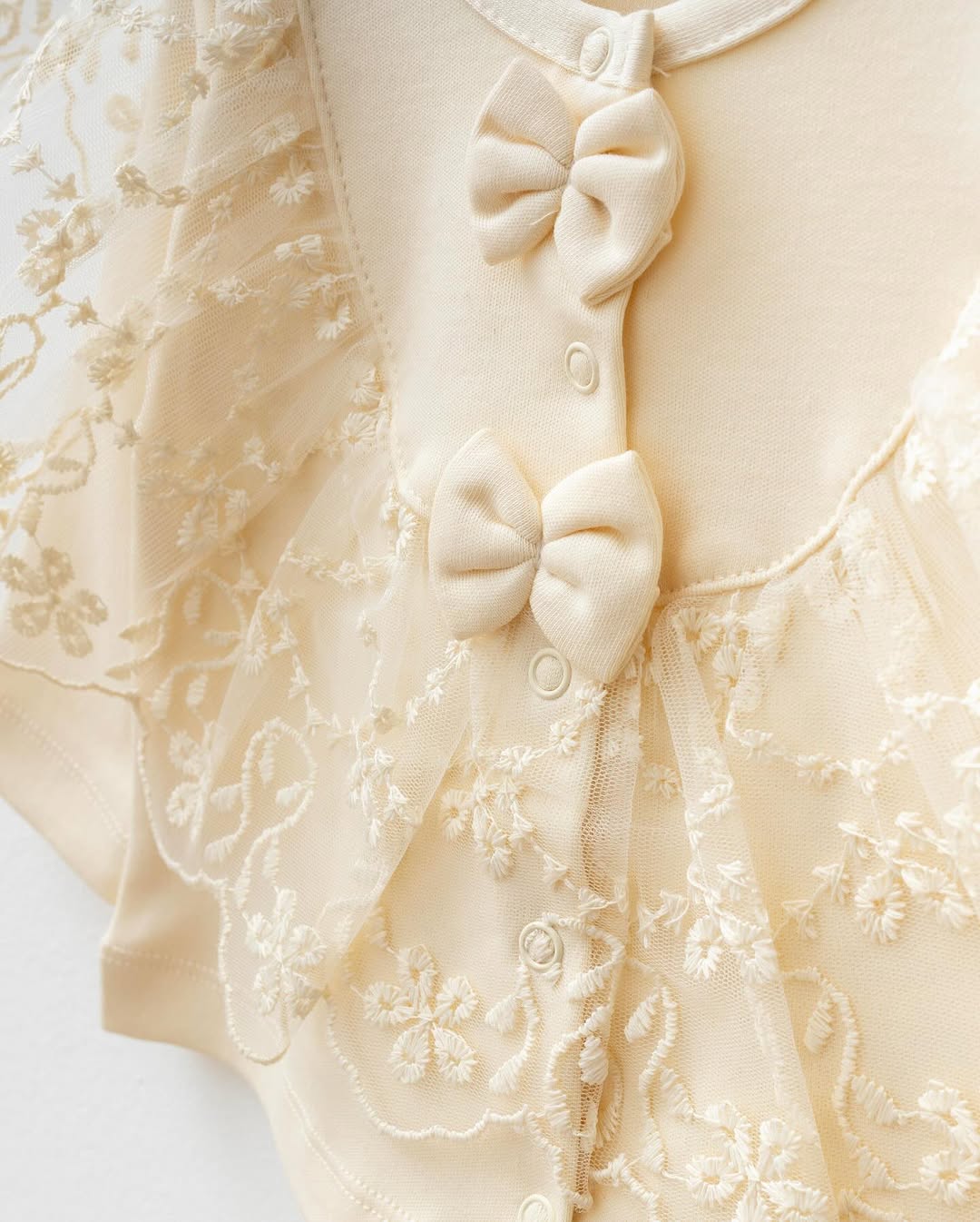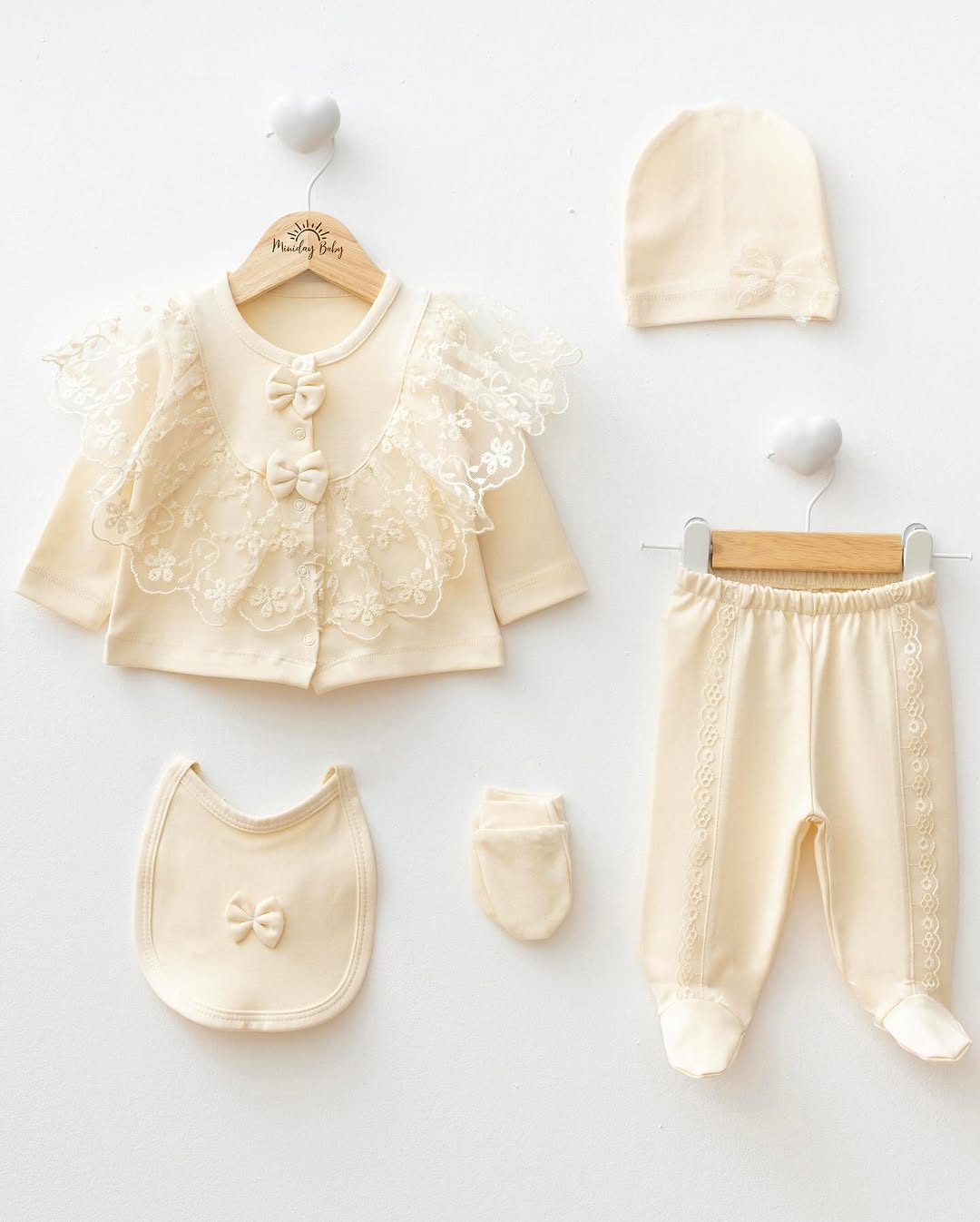 This enchanting 5-piece set is perfect for welcoming your little one or for dressing them in a beautiful, classic style. The soft, creamy color and delicate lace details give this outfit a timeless, angelic feel.