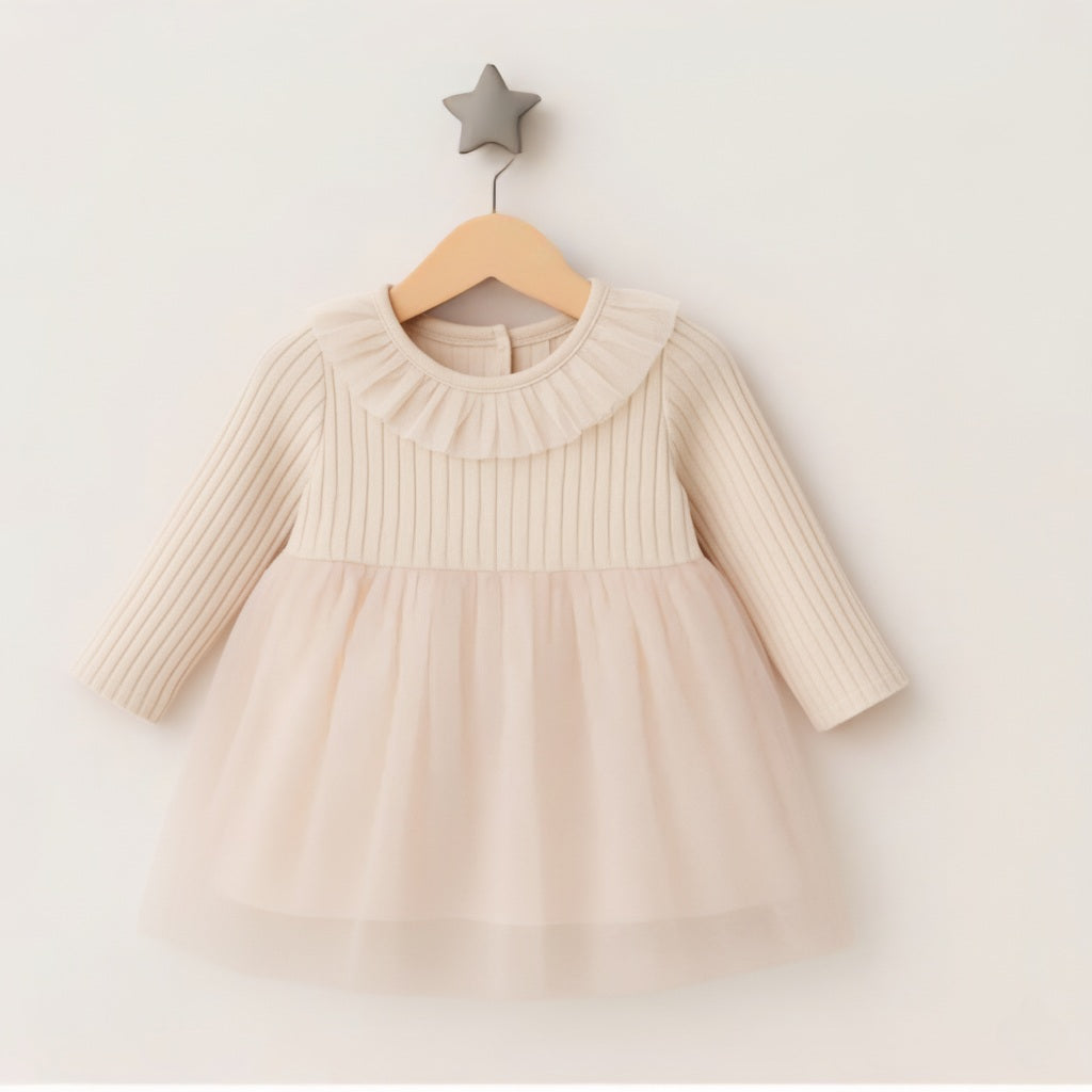 A long-sleeved dress with a soft, ribbed knit top and a frilly neckline. The attached skirt features a light, airy tulle overlay with subtle polka dot details, giving it a playful tutu-like feel.