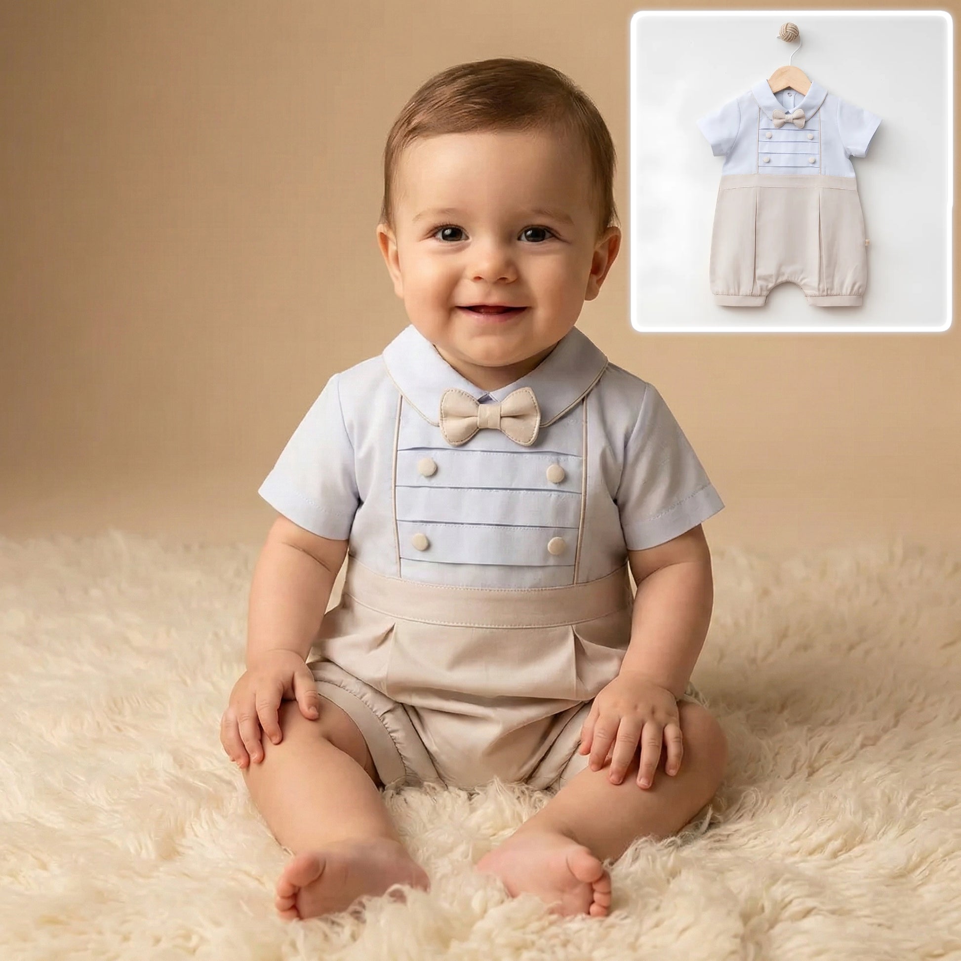 This formal romper is ideal for any special occasion for your baby boy. Available in sizes 0 to 12 months, it comes in a classic blue or beige color. Made with high-quality materials, it provides both comfort and style for your little one. Perfect for any formal event.