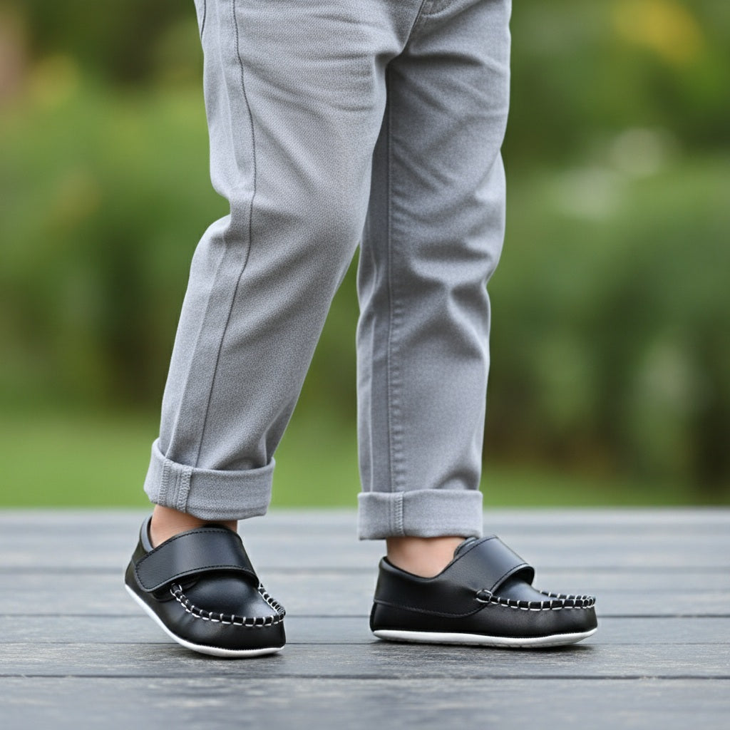 Vintage-Inspired Black Baby Moccasins – Soft Leather Slip-On Shoes for Infants & Toddlers