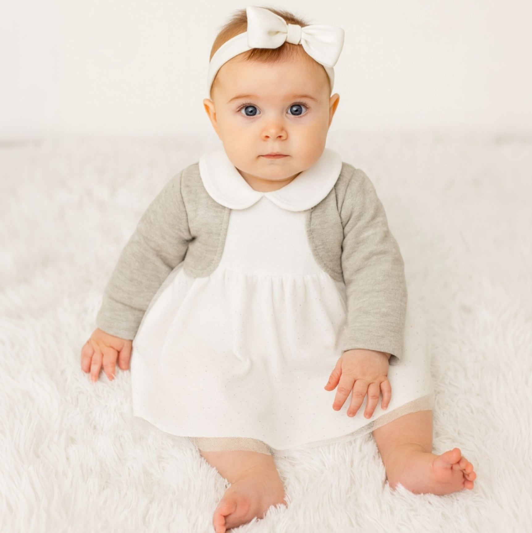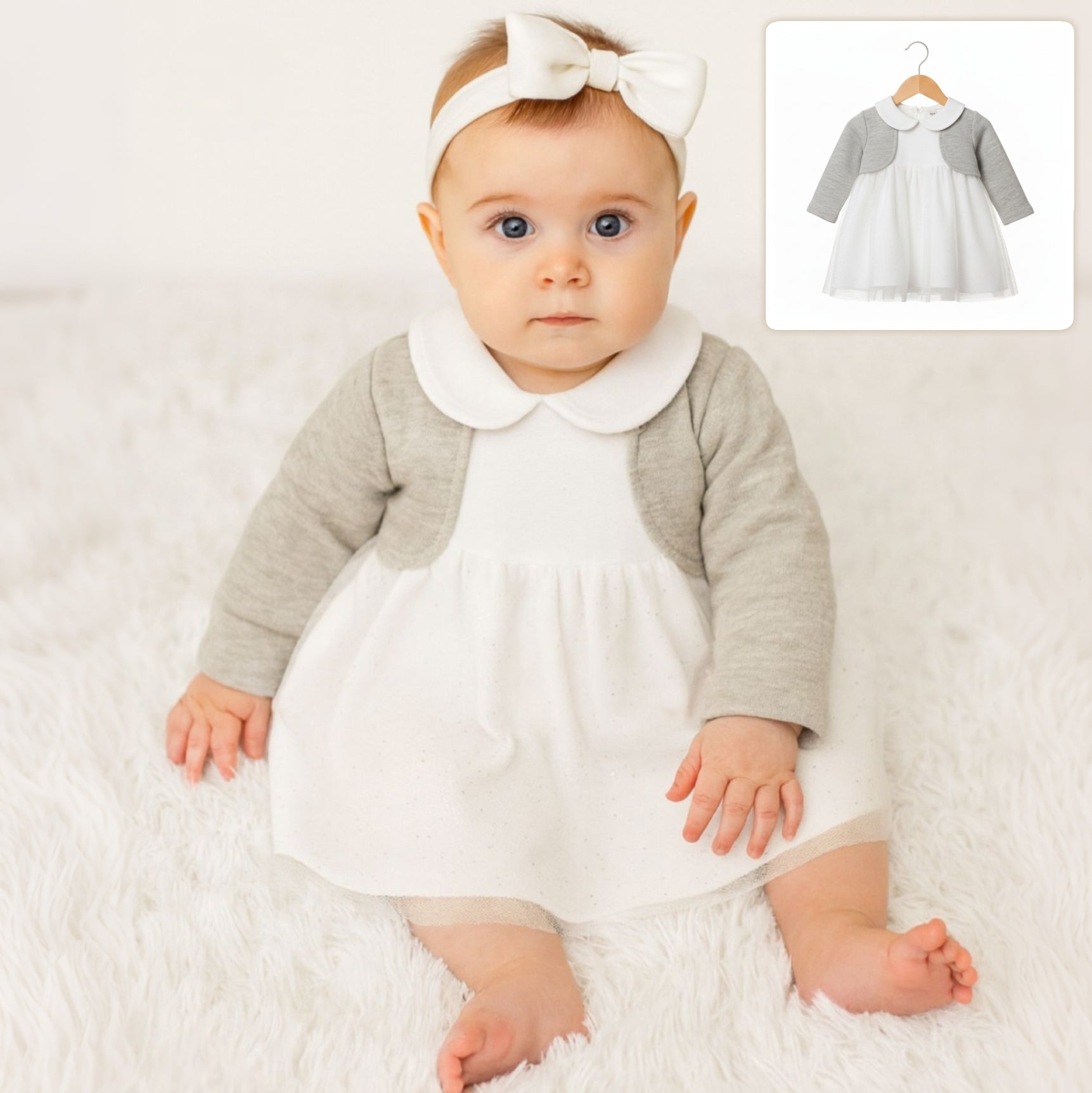 Graceful and timeless, our white and gray baby dress is designed for special moments. The sheer white skirt features subtle dotted patterns and a gentle flare, while the top includes a crisp Peter Pan collar and a sewn-in gray bolero-style overlay with long sleeves. This elegant combination creates a layered look that’s perfect for formal events, family gatherings, or milestone celebrations.
